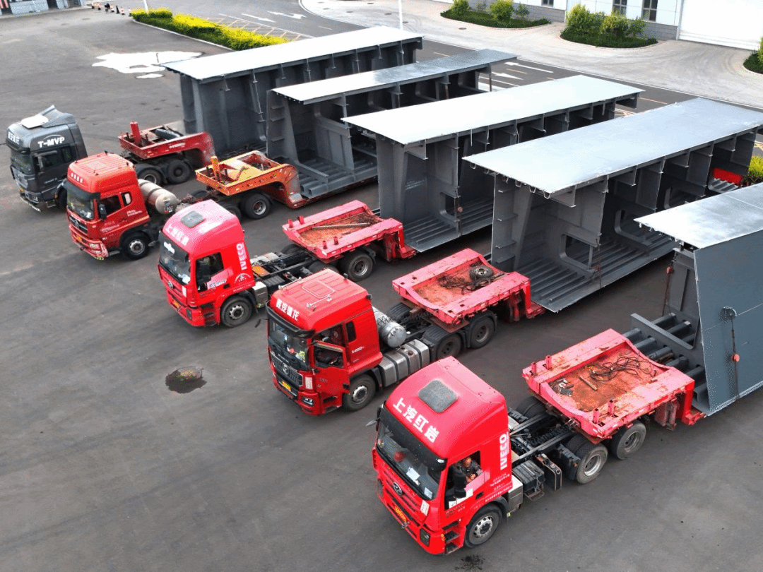 鋼箱梁裝車完畢,即將發(fā)運(yùn)到項(xiàng)目施工現(xiàn)場(chǎng)