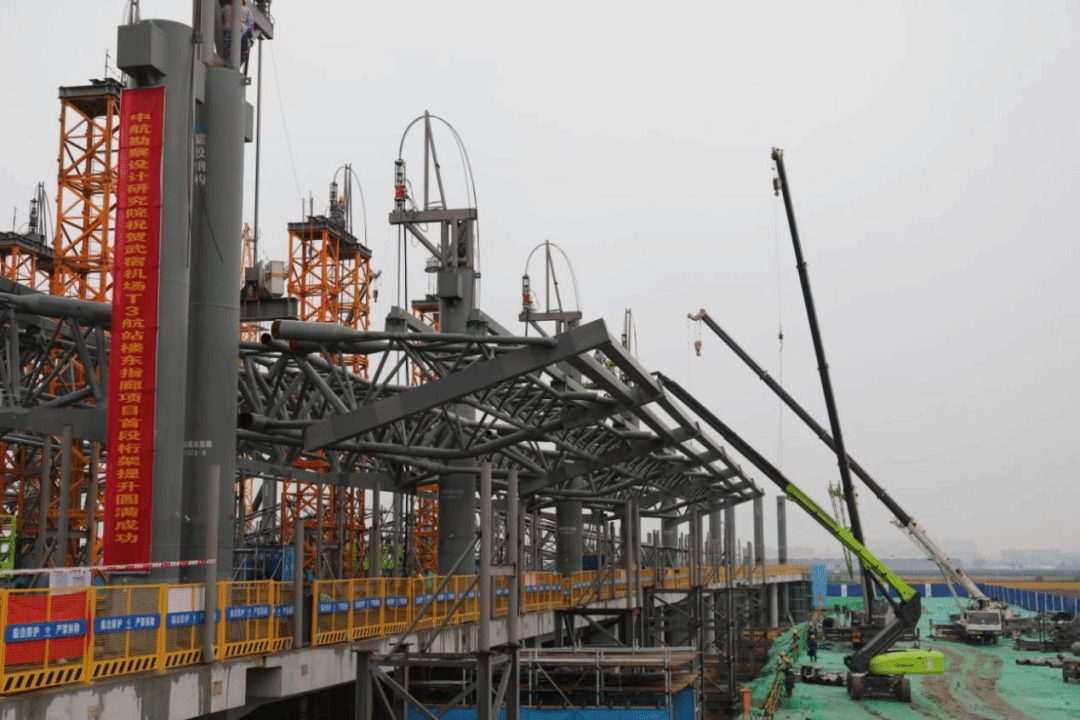 太原武宿國(guó)際機(jī)場(chǎng)T3航站樓東指廊項(xiàng)目屋蓋桁架首段提升圓滿成功